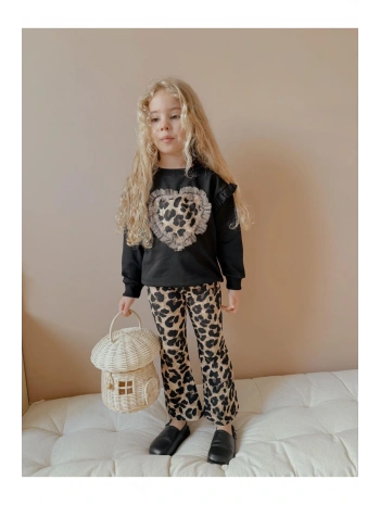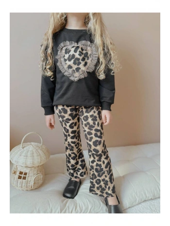Kız Çocuk Leopar Kalpli Sweat / İspanyol Paça Pantolon Mevsimlik Şık Takım