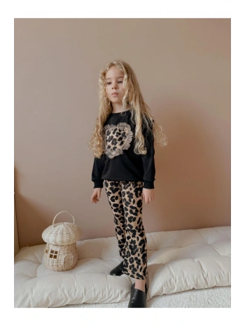 Kız çocuk leopar kalpli İspanyol pantalonlu iki iplik mevsimlik şık takım