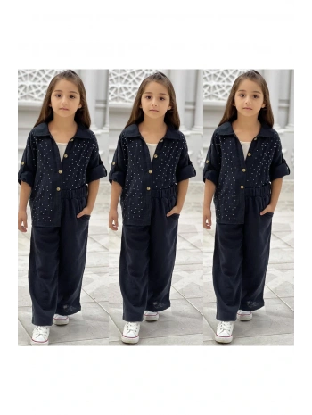 Kız Çocuk Taşlı Müslin Gömlek Pantolon Thsort Takım