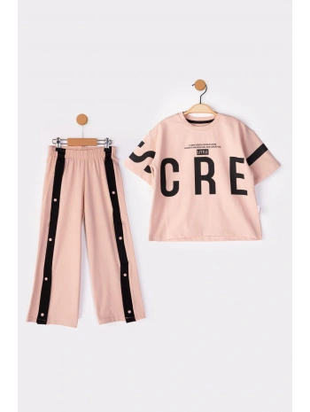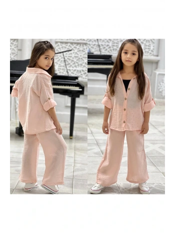 Kız çocuk müslin kumaş taşlı Somon rengi Gömlek thsort pantolon Takım