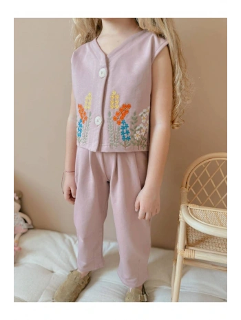 Bayramlık Wikiboom Çiçek Nakışlı Yelek Pantolon Takımı %100 Pamuklu