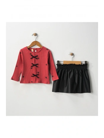 Deri Etek Fitilli Bisiklet Yaka Fiyonk Detaylı Bluz Takım