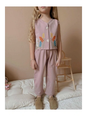 Bayramlık Wikiboom Çiçek Nakışlı Yelek Pantolon Takımı %100 Pamuklu
