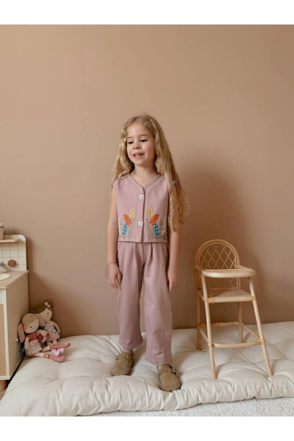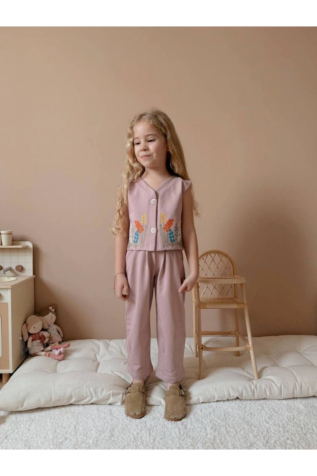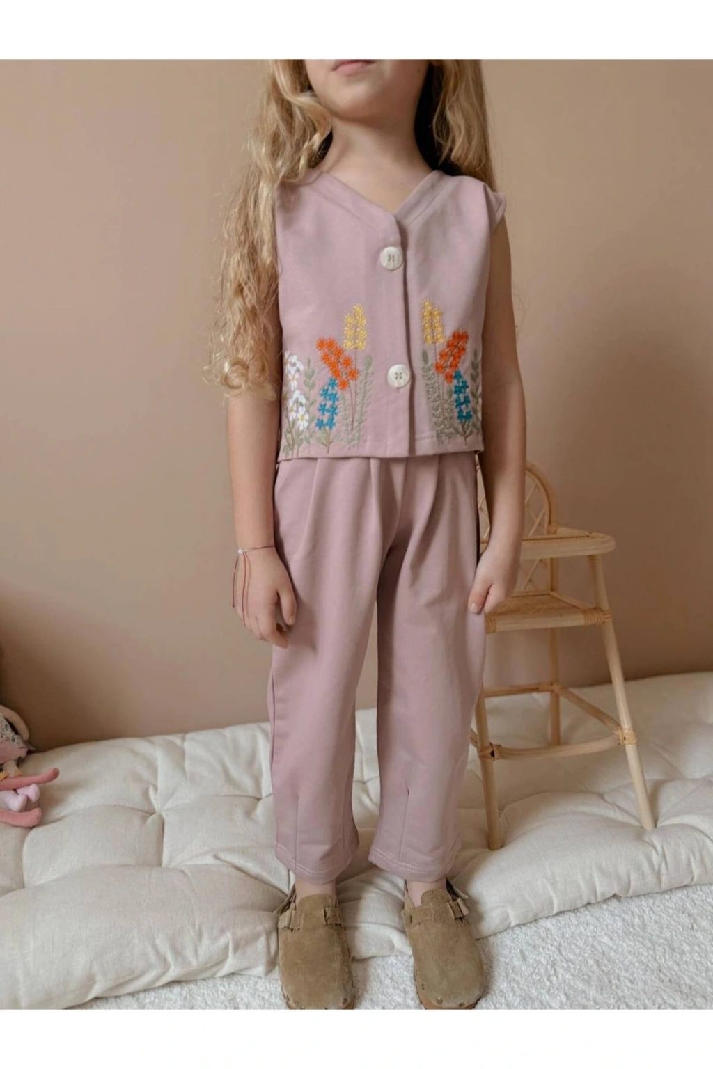 - V yaka tasarımı ile şıklığı ve rahatlığı bir arada sunar.; - Sargı nakış tekniğiyle detaylandırılmış çiçek deseni, göz alıcı bir görünüm kazandırır.; - Kemersiz yapısı sayesinde pratik kullanım sağlar ve farklı stiller oluşturmanıza olanak tanır.; - Her mevsim tercih edebileceğiniz çok yönlü tasarım, gardırobunuzun vazgeçilmezi olacak.; - Paket içeriğindeki 1 adet yelek ve pantolon kombinasyonuyla tam bir uyum sergiler.; - 2 iplik dokuma tipi, dayanıklılığı artırırken yumuşak dokusuyla konfor sunar.; - Sürdürülebilir malzemelerden üretilmiş olması çevre dostu bir seçimdir.; - Boru paça kesimi modern ve zamansız bir stil vurgular.; - İnce yapısıyla hafif ve ferah hissettiren bu takım, günlük kullanım için idealdir.; - Normal boy uzunluğuyla her türlü ayakkabı tarzına kolayca uyum sağlar.; - Kadın ve kız çocukları için özel olarak tasarlanmıştır; genç ruhları yansıtan renklerle doludur.; - Türkiye menşeli olması yerel üretim standartlarına uygunluk gösterirken kaliteyi de garanti eder.; - Regular kalıp ile rahat hareket etme özgürlüğü sunarken vücut hatlarını nazikçe sarar.; - Çocukların enerjisine hitap eden nakışlı işlemeli desenlerle eğlenceli anlar yaşatır.; - Dokuma kumaş tipi sayesinde uzun süreli kullanım vaat ederken formunu korur.; -Kolsuz kol boyu ile yaz aylarında serinlik hissi verirken şık duruşundan ödün vermez.; -Yelekli pantolonlu alt üst takım olarak hem işlevsellik hem de estetik açıdan bütünsel bir deneyim sunar.; -Gündüzden geceye geçişte ideal ortamlarda rahatlıkla tercih edilebilir; çok yönlülük sağlar.