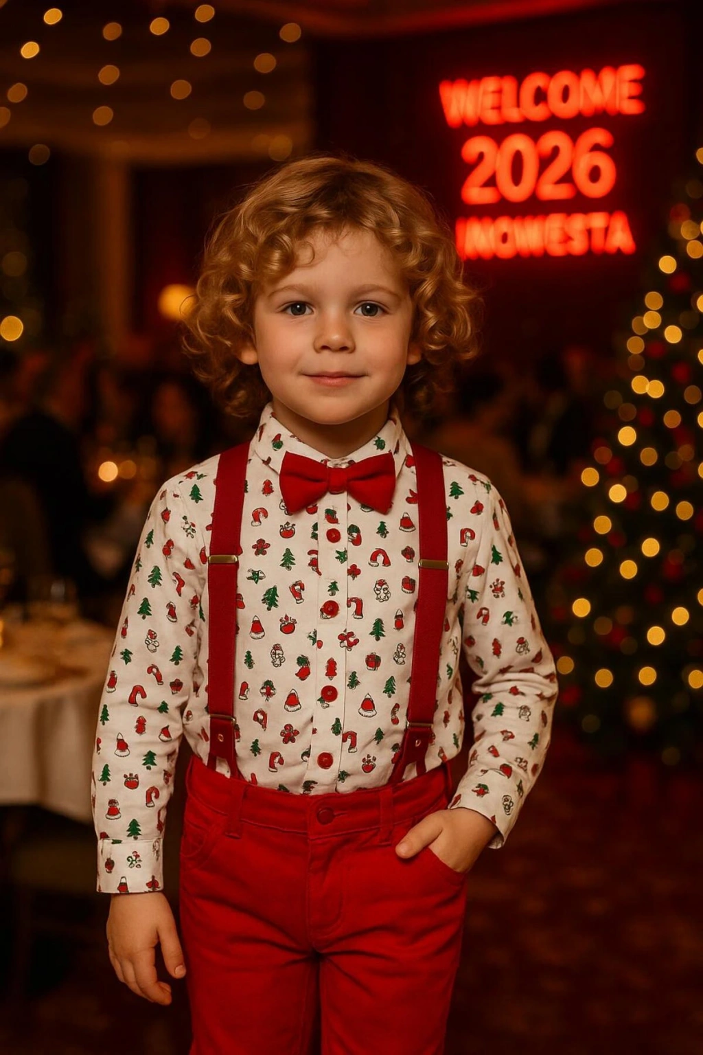 - Yılbaşı temalı deseniyle dikkat çeken bu takım, çocukların özel günlerde şıklığını tamamlar.; - Uzun kol ve regular paça tasarımı, rahat hareket etme olanağı sunar ve şık bir görünüm sağlar.; - Doğal düğme detayı ile hem estetik hem de fonksiyonel bir kullanım sunar.; - Sivri yaka tasarımı, takımın şık ve modern görünümünü pekiştirir.; - Pamuk materyali sayesinde cildi tahriş etmeden konforlu bir deneyim sunar.; - Party koleksiyonuna ait bu takım, özel etkinliklerde çocukların stilini ön plana çıkarır.; - Türkiye'de üretilmiş olup, yerel işçilik ve kaliteyi temsil eder.; - Regular kalıp ile rahat bir kullanım sağlarken, uzun boy kesimiyle de zarif bir duruş sergiler.; - Dokuma kumaş tipi sayesinde dayanıklılık ve uzun süreli kullanım vaat eder.; - Erkek çocukları için tasarlanmış olup, onların yılbaşı ruhuna uygun bir seçimdir.; Aylık Grubumuz zıbınlıdır alttan gömlek çıtçıtıdır.;