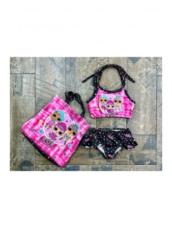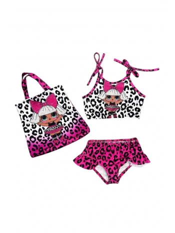 Kız çocuk Lol bebek desenli mayo bikini çantalı 3 lü takım