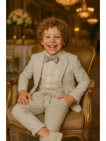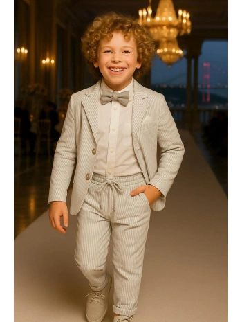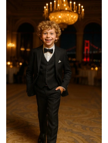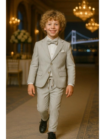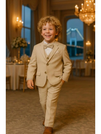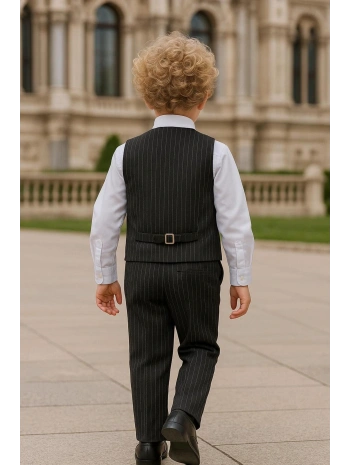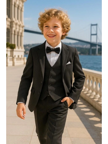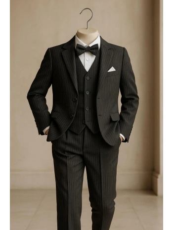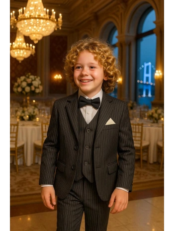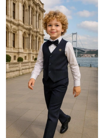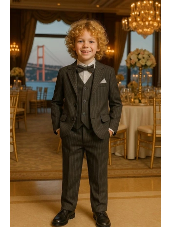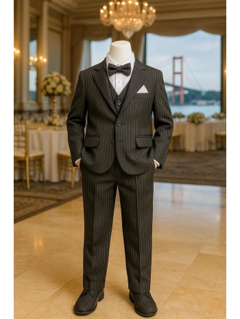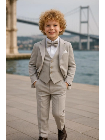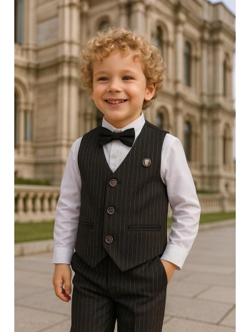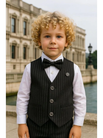 Erkek Çocuk Ceket Gömlek Yelek Pantolon 4'Lü Papyonlu Çizgili Takım Elbise