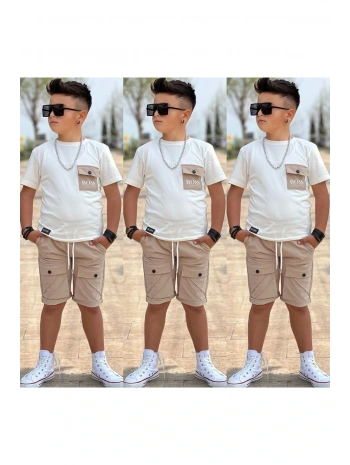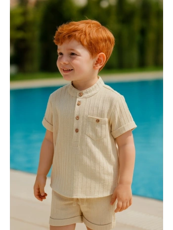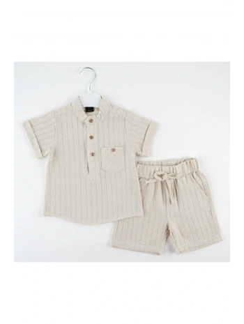 Erkek Çocuk Müslin Kumaş Şortlu Alt Üst Takım Bej Rengi Bir Beden Büyük Alınız