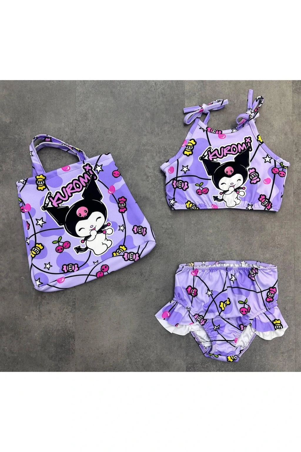 Kız çocuk kuromi dalgıç kumaş kalite kalıp çantalı üç parça mayo bikini yazlık tatil