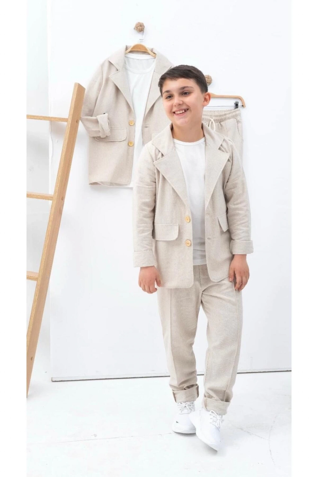 - Haki rengindeki bu takım, şıklığı ve rahatlığı bir arada sunarak çocukların günlük kullanımına uygun.; - Slim kalıbıyla modern ve zarif bir görünüm sağlar, hareket özgürlüğünü kısıtlamaz.; - %100 pamuk materyali sayesinde cildi tahriş etmeden yumuşak bir dokunuş sunar.; - Uzun paçalı tasarımı ile hem konforlu hem de stil sahibi bir duruş sergiler.; - Ceket yakası detayı ile resmiyetten ödün vermeyen bir tarza sahiptir; özel günlerde veya gece davetlerinde idealdir.; - Truvakar kol kesimiyle klasik çizgilere modern bir yorum getirirken, düz deseniyle sadelikten yana olanların tercihidir.; - Business koleksiyonuna ait bu takım, işlevsellikle estetiği buluşturur; okuldan sosyal aktivitelere kadar her ortama uygundur.