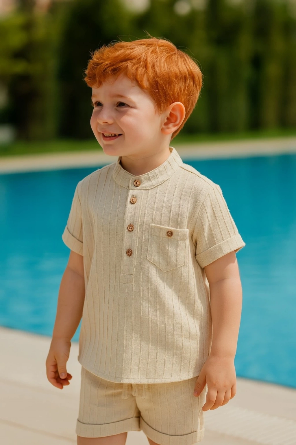 Erkek Çocuk Müslin Kumaş Şortlu Alt Üst Takım Bej Rengi Bir Beden Büyük Alınız