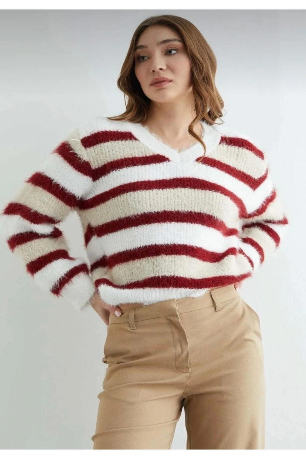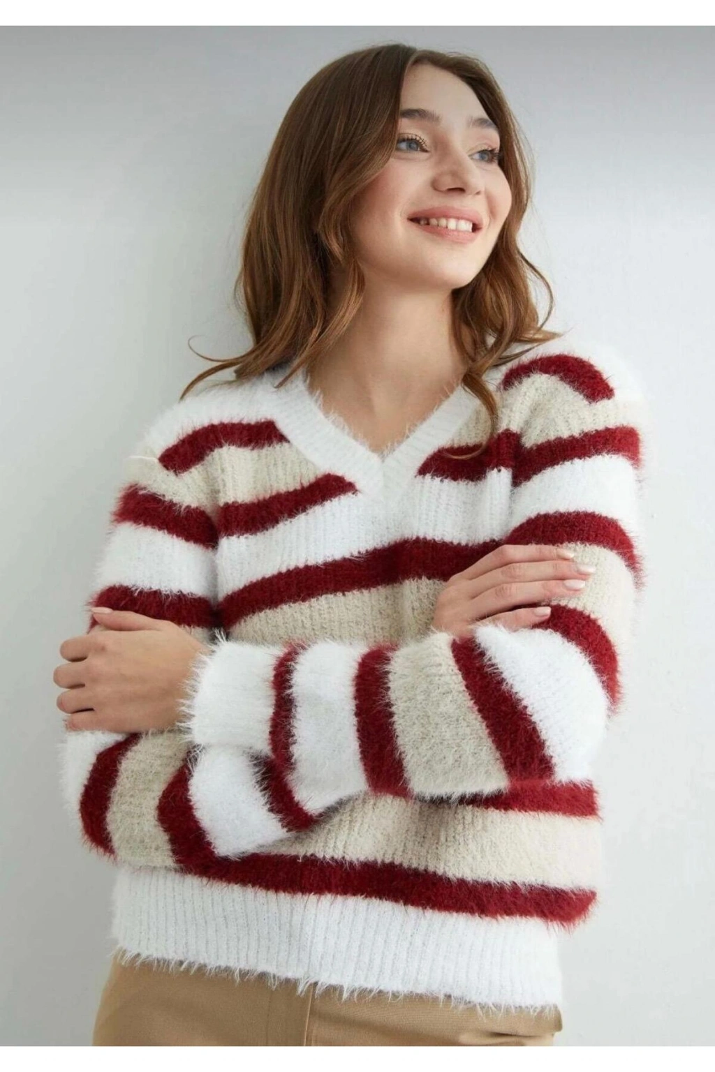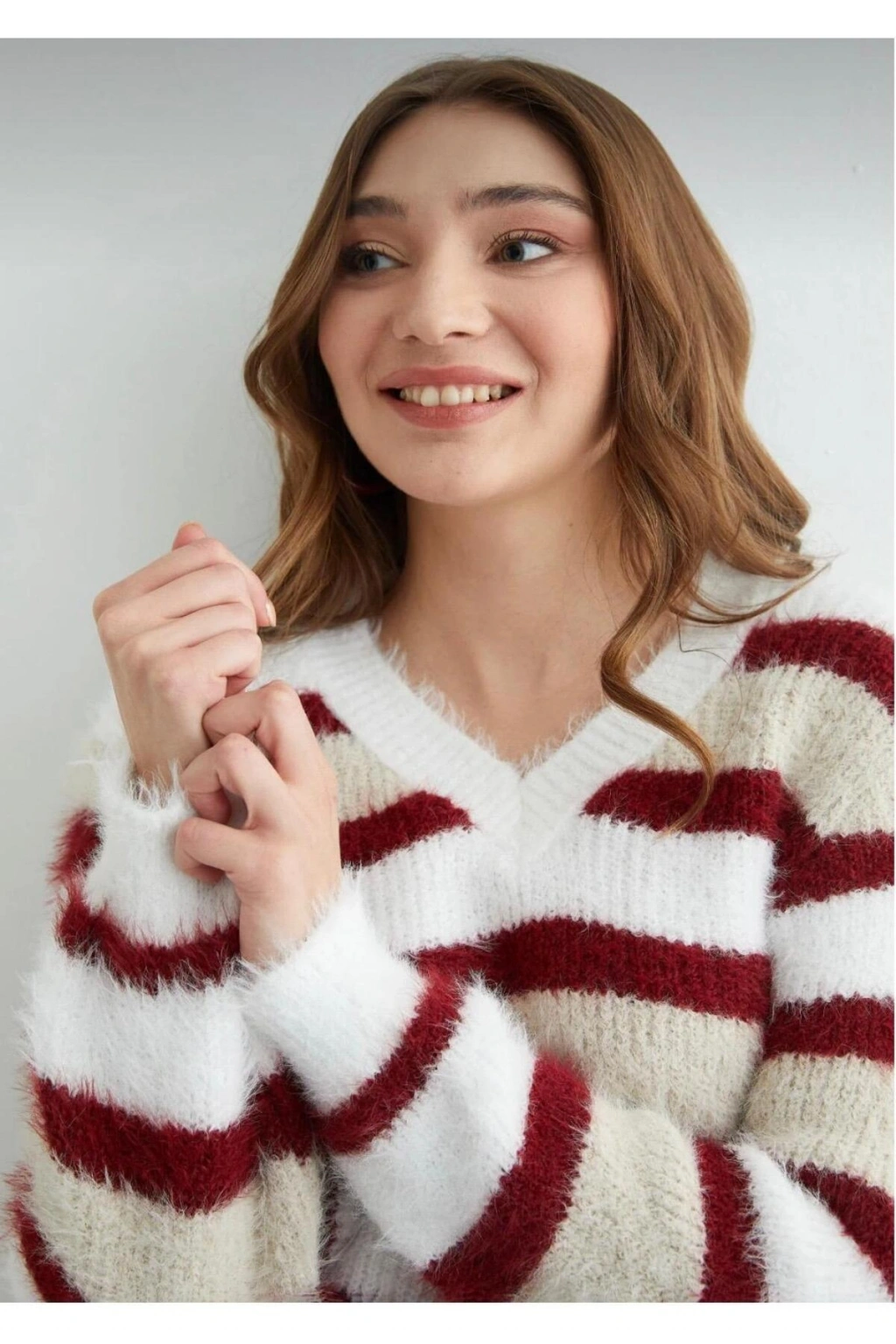 Kadın Sakallı Triko V Yaka Kazak (Yumuşak Tuşe) standart Beden