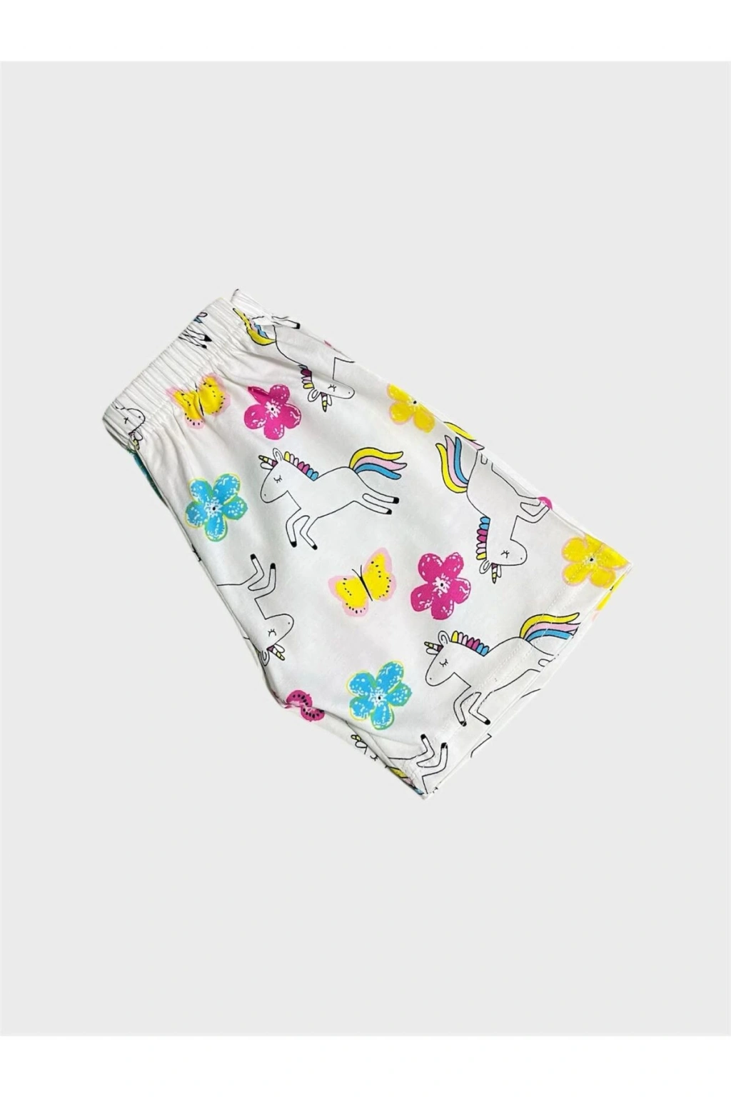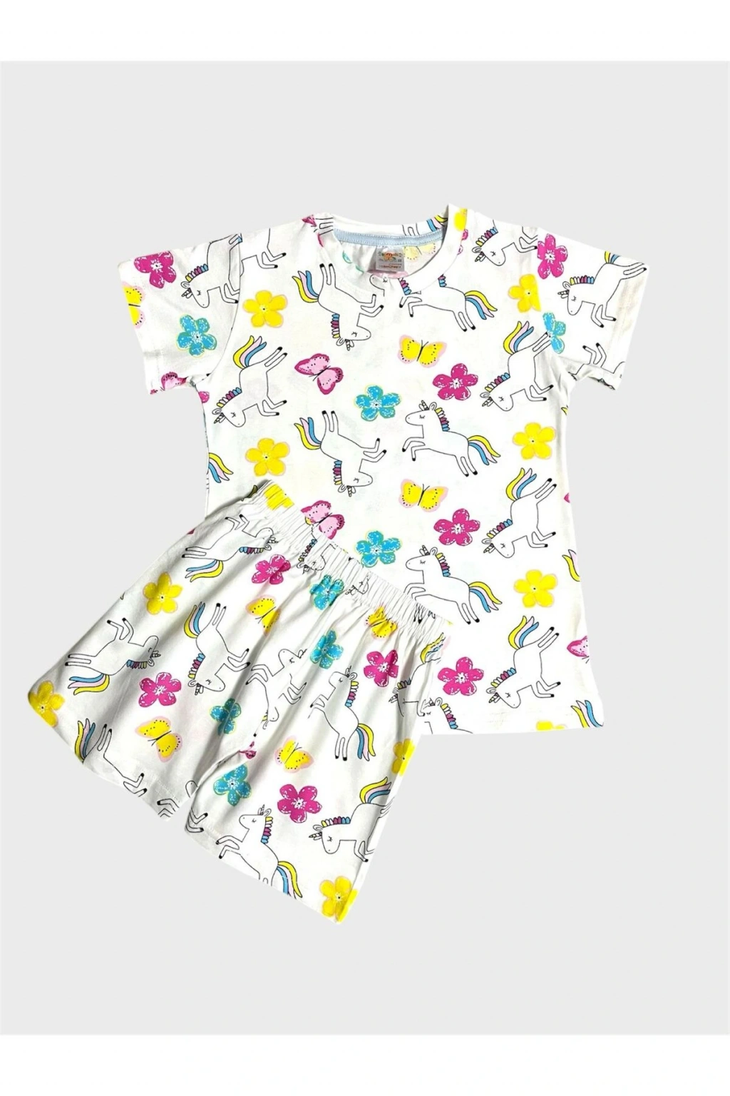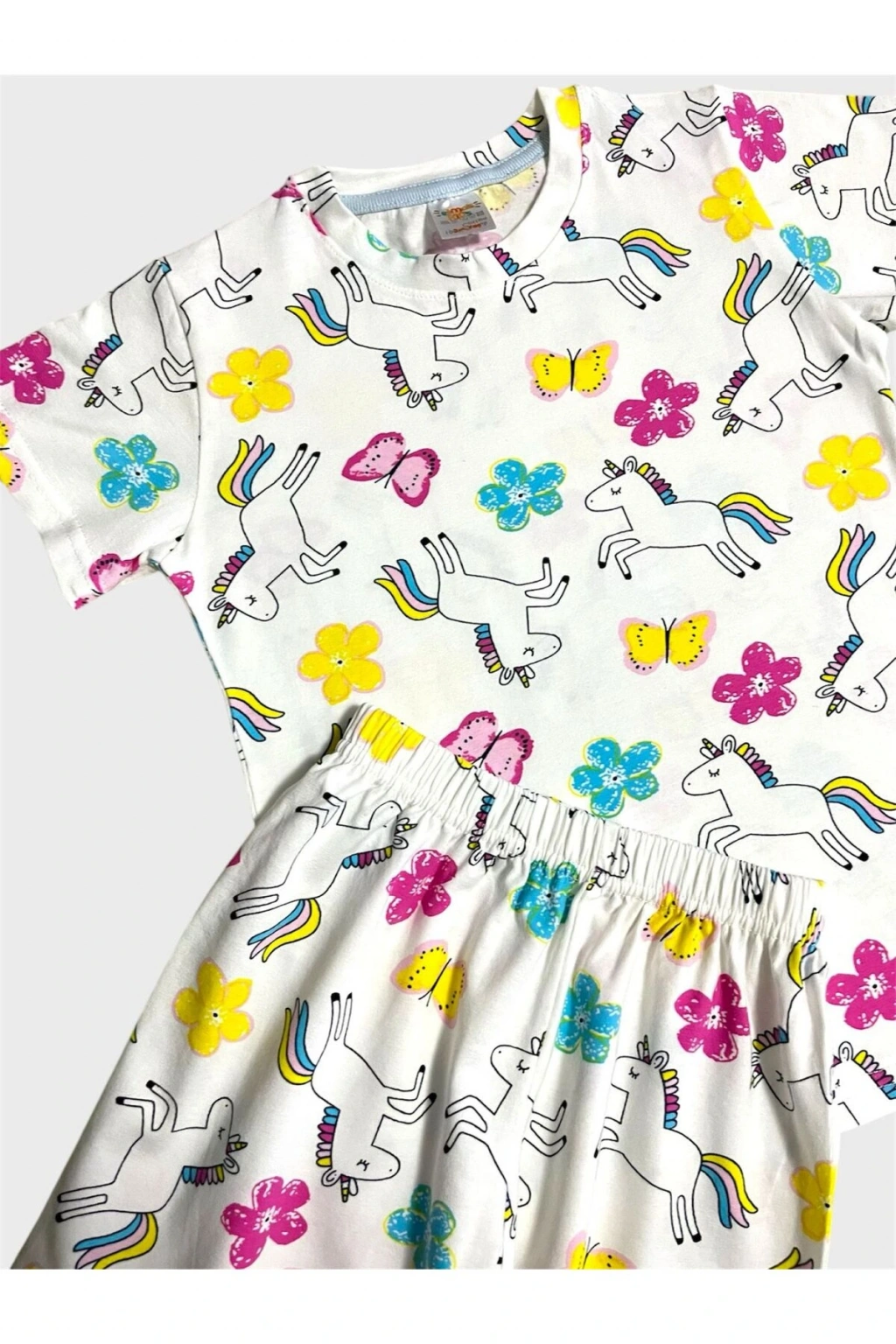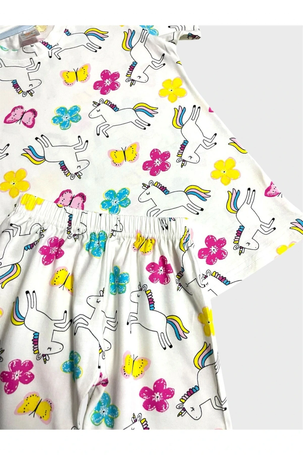 - %100 pamuklu kumaşı ile cildi tahriş etmeden yumuşak bir dokunuş sunar.; - Beyaz renkli ve sevimli unicorn kelebek deseniyle çocukların hayal dünyasına hitap eder.; - Kısa kollu tasarımı sayesinde yaz ayları boyunca serinlik ve rahatlık sağlar.; - Pamuklu materyali terletmez ve nefes alabilir yapıdadır, böylece gece boyu konforlu bir uyku deneyimi sunar.; - Bisiklet yakası sayesinde kolay giyilip çıkarılabilir ve hareket özgürlüğü tanır.; - Kısa kol tasarımı ile yaz akşamlarında serin kalmanız için idealdir.; - Homewear ortamına uygun olarak tasarlanmış olup evde şıklığı ve rahatlığı bir arada yaşamanızı sağlar.; - Regular kalıp ile vücuda tam oturan ancak sıkıştırmayan bir yapıya sahiptir.; - Standart boy ölçüsüyle farklı bedenlere uyum göstererek geniş kullanım alanı sunar.