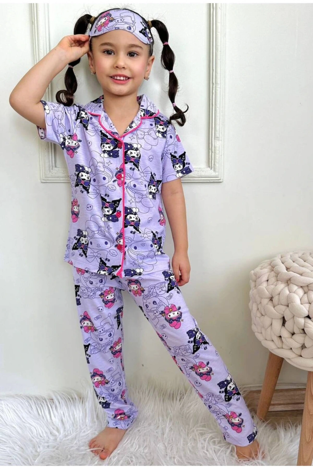 Kız çocuk düğmeli kısa kollu Kuromi pijama takımı göz bandı dahil