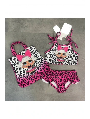 Çantalı Üçlü Kız Çocuk Fırfırlı Bikini Takım Üstü Baskılı Kız Çocuk Mayo