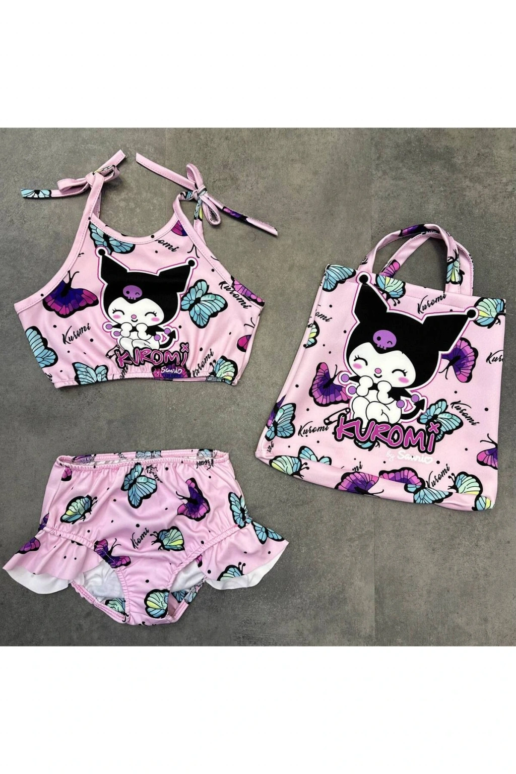 Kız çocuk kuromi dalgıç kumaş kalite kalıp çantalı üç parça mayo bikini yazlık tatil