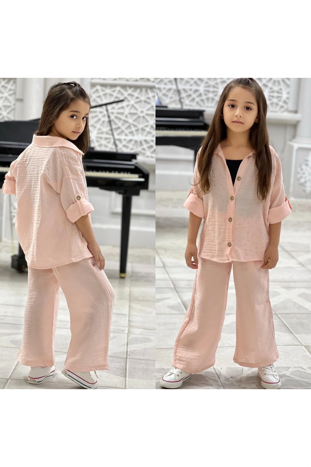 Kız çocuk müslin kumaş taşlı gömlek pantolon thsort takım