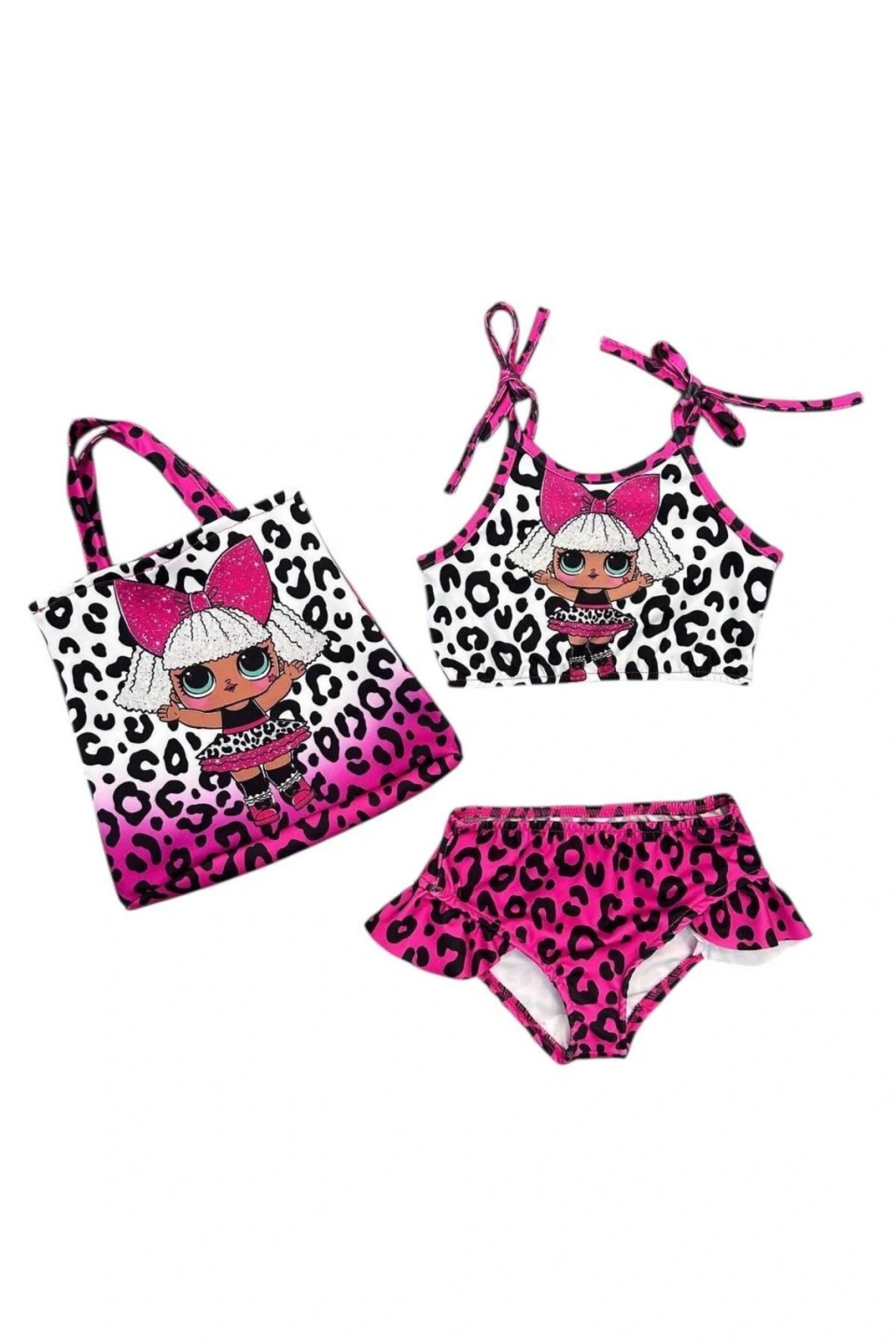 - Çocukların plaj keyfini tam anlamıyla yaşayabilmesi için tasarlanmış, pembe-beyaz renklerdeki bebek baskılı bikini takımı.; - Üç parçadan oluşan set; bikini üstü, altı ve çantasını içerir, böylece çocuklar plajda şıklığını korurken aynı zamanda pratiklikten de ödün vermez.; - Özel olarak plaj tekstil koleksiyonuna ait bu bikini takımı, yaz aylarının enerjisine uygun canlı desenleriyle dikkat çeker.; - Hafif ve nefes alabilen dalgıç/scuba kumaştan üretilmiştir, sıcak havalarda bile rahatlık sağlar.; - Kolsuz tasarım sayesinde çocukların hareket özgürlüğünü kısıtlamaz ve güneşin tadını çıkarmalarına olanak tanır.; - Pratik bağlama/bağcık kapama şekli ile kolayca giyilip çıkarılabilir; böylece çocuklar kendi kendilerine bağımsızlık kazanabilirler.; - Lastikli detayları sayesinde vücuda mükemmel uyum sağlayarak kayma veya sıkışma yapmaz.; - Dokuma kumaş tipi dayanıklılığı arttırırken aynı zamanda estetik görünümünden ödün vermez.; - Çocuklar için ideal yaş grubuna uygun olarak tasarlanmıştır; minik prenseslerin gardrobunun vazgeçilmezi olacak.; - Külot alt silueti ile modern ve şık bir görünüm sergilerken aynı zamanda rahatlık sunar.; - Normal bel kesimi sayesinde gün boyu konforlu bir kullanım imkanı tanır.;