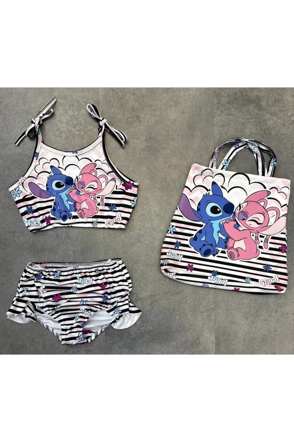 Kız çocuk stitch mayo dalgıç kumaş çantalı üç parma bikini takımı mayo yazlık tatillik mayo havuz