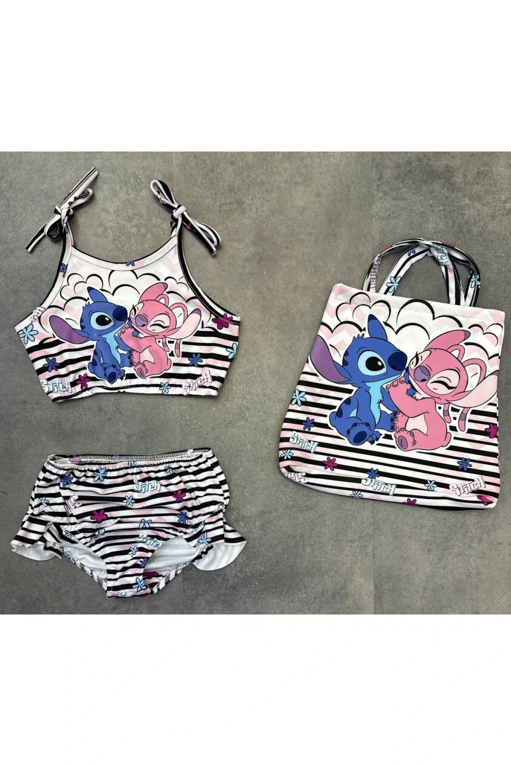 Kız çocuk stitch baskılı üç parça çantalı mayo bikini yazlık tatil