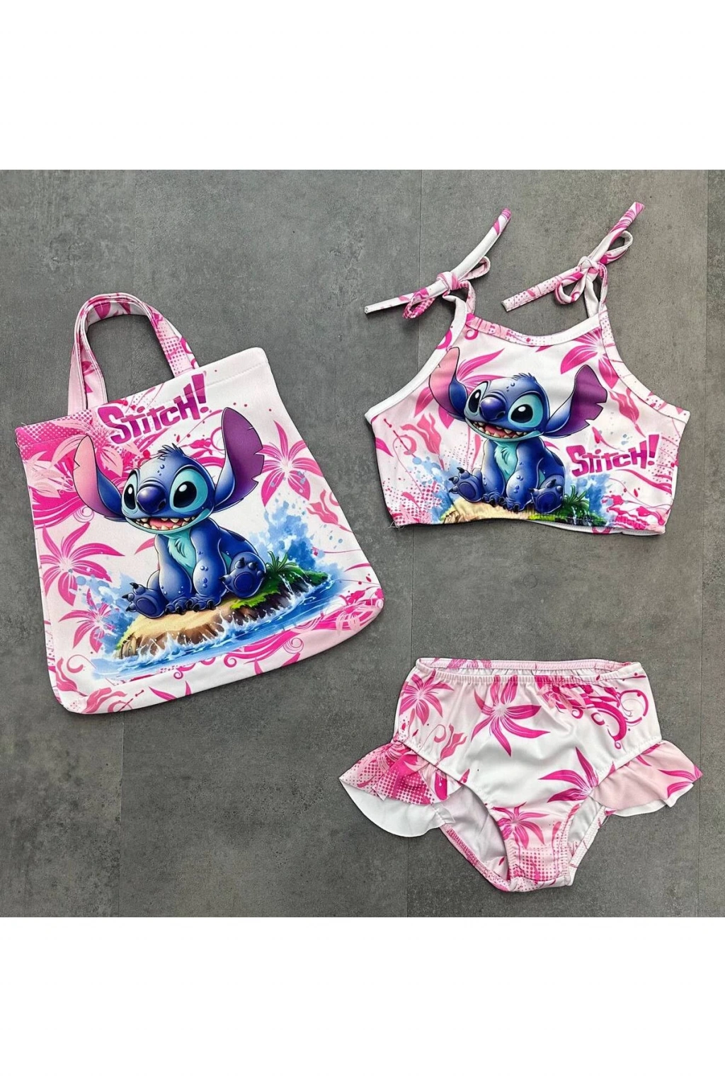 Kız çocuk stitch baskılı üç parça çantalı mayo bikini yazlık tatil