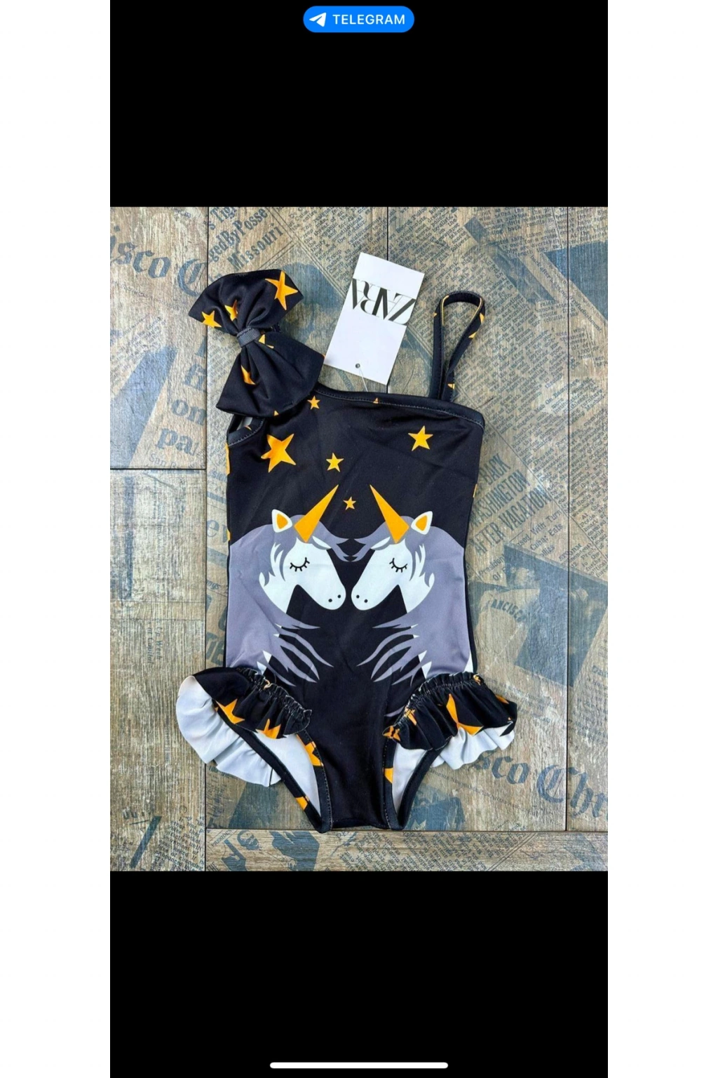 Kız çocuk unicorn desen siyah kurdele detaylı siyah mayo