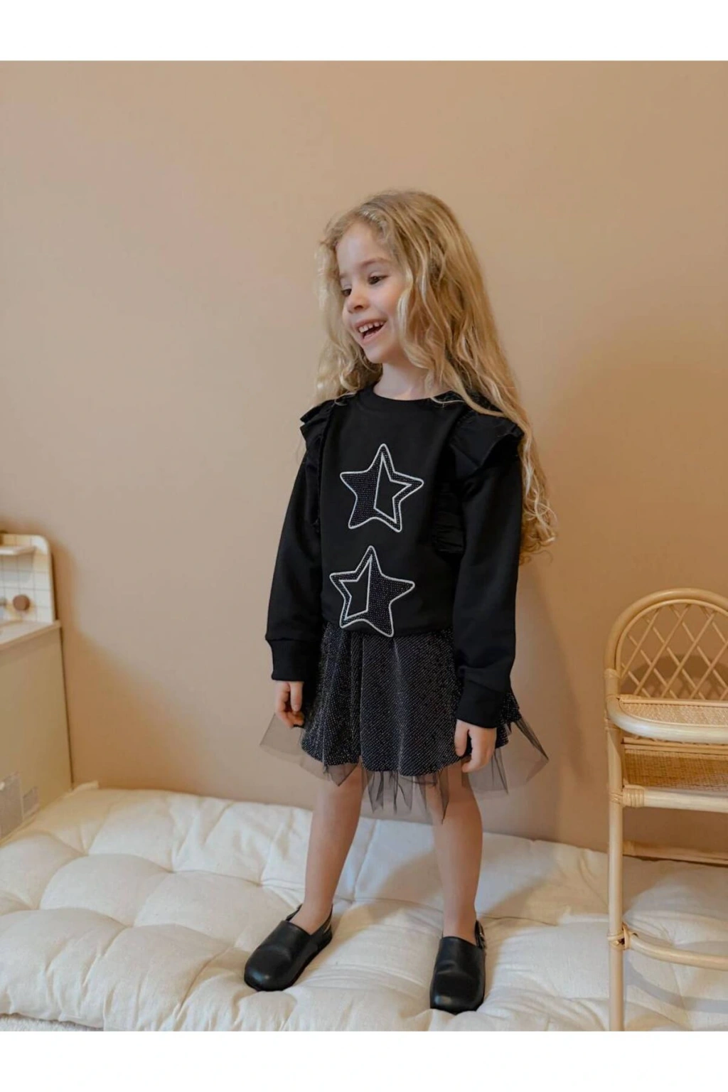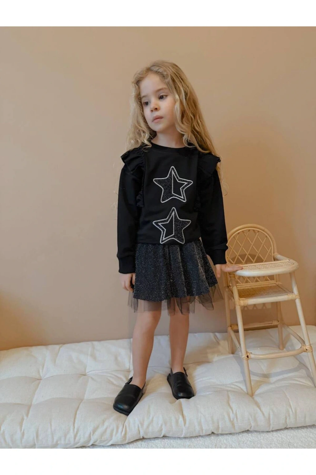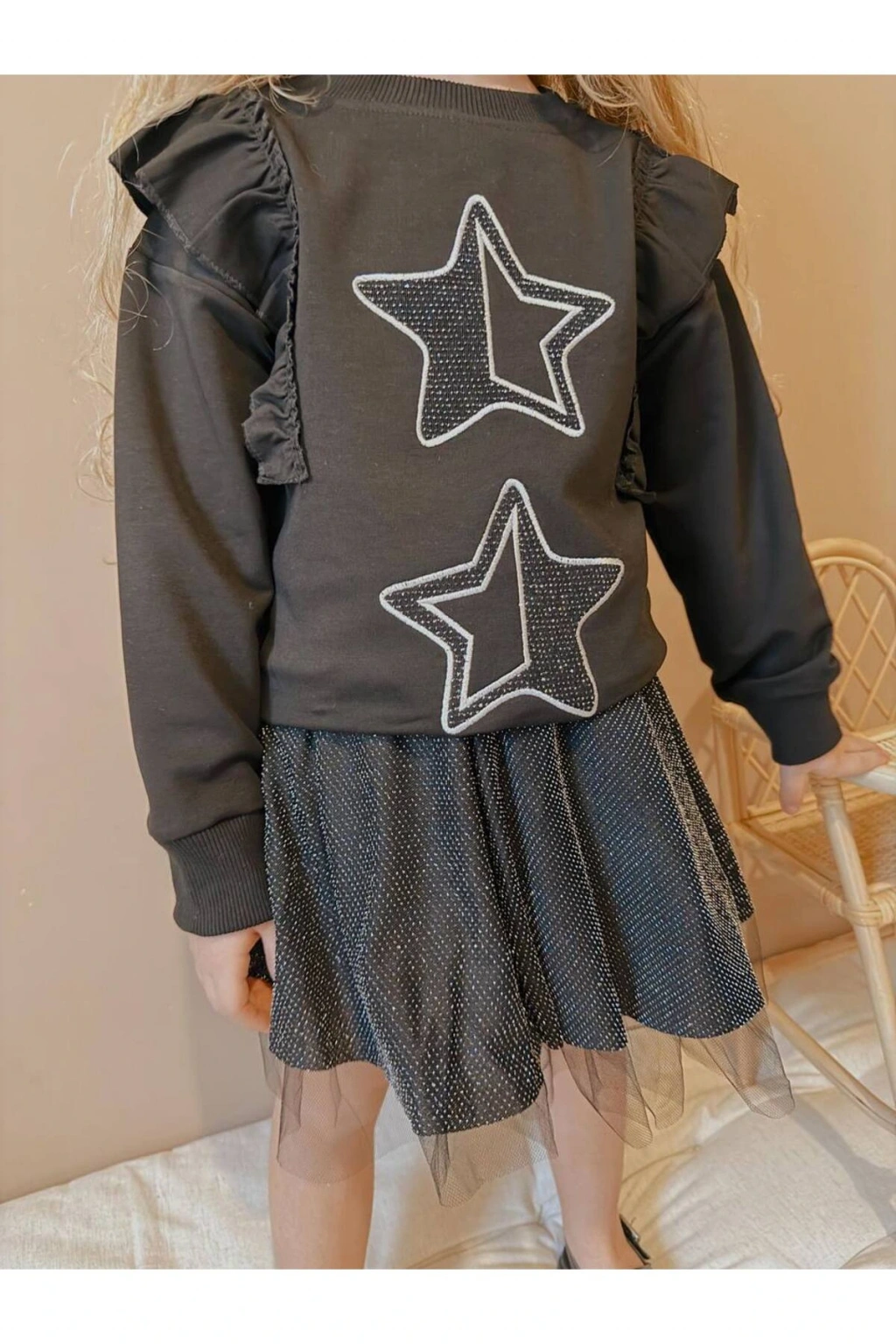 Kız çocuk yıldız detay etek pamuk simli üst likralı iki iplik şık takım
