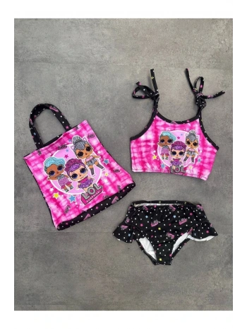 Kız Çocuk ve Bebek Lol Desenli Hızlı Kuruyan Fırfırlı 3 Parça Alt Üst Mayo Ve Çanta Takımı