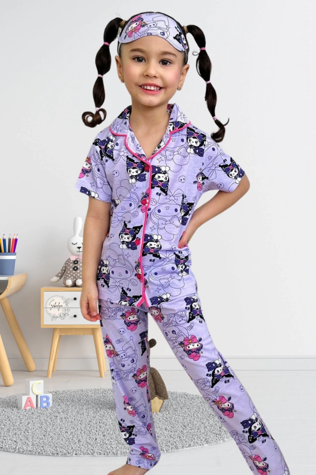 Kız çocuk düğmeli kısa kollu Kuromi pijama takımı göz bandı dahil