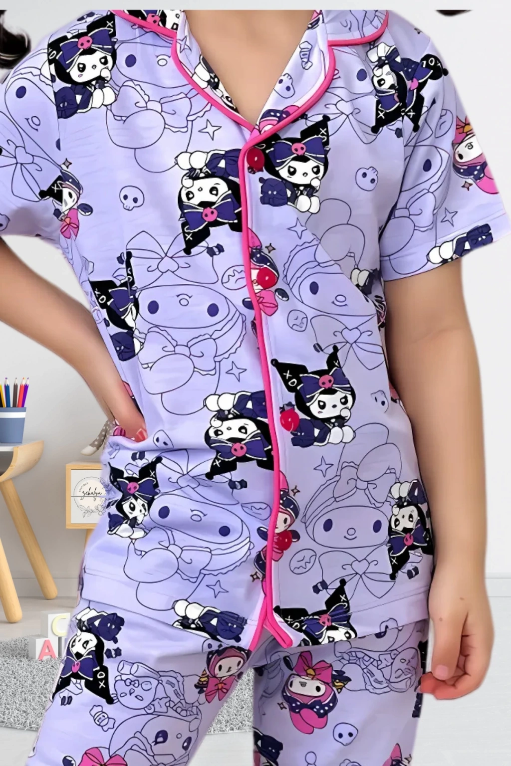 Kuromi Kız Çocuk Gömlek Yaka Düğmeli Kısa Kollu Lila Pijama Takımı