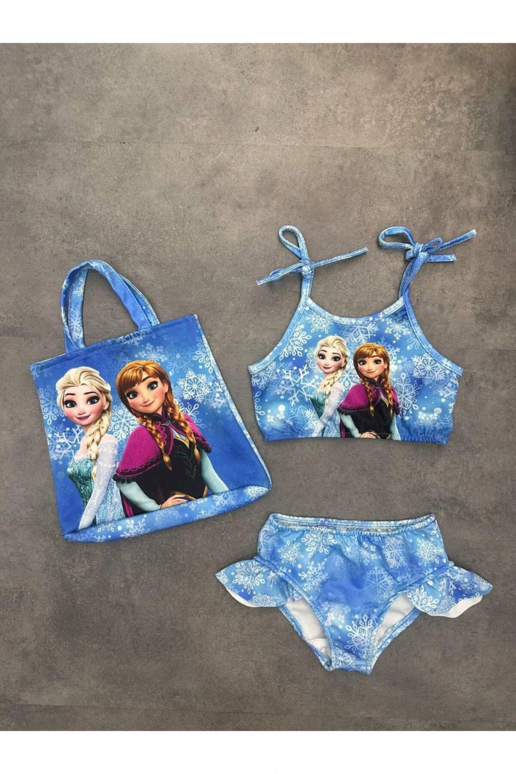 Kız Çocuk karakter Baskılı Eteği Fırfırlı- ip bağlamalı ÇANTA Mayo Bikini 3 lü Takım