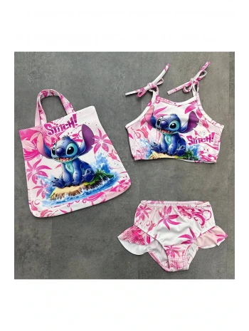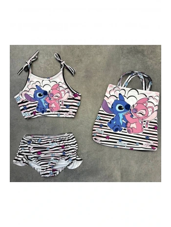 Kız çocuk stitch baskılı üç parça çantalı mayo bikini yazlık tatil