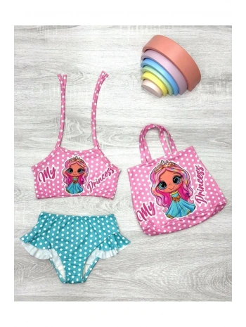 Kız Çocuk karakter Baskılı Eteği Fırfırlı- ip bağlamalı ÇANTA Mayo Bikini 3 lü Takım