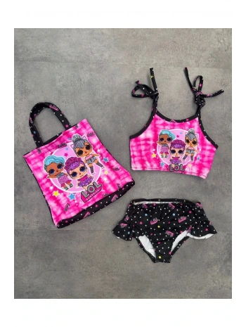 Kız Çocuk ve Bebek Lol Desenli Hızlı Kuruyan Fırfırlı 3 Parça Alt Üst Mayo Ve Çanta Takımı