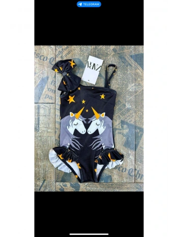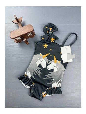 Kız çocuk unicorn desen siyah kurdele detaylı siyah mayo