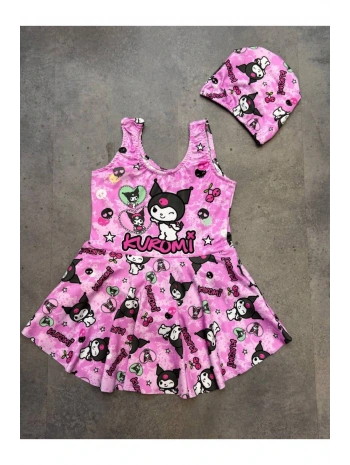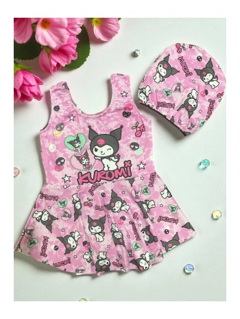 Kız Çocuk Pembe Renk Kuromi Desenli Etekli Pileli Sık Dokuma Hızlı Kuruyan Esnek Boneli Mayo