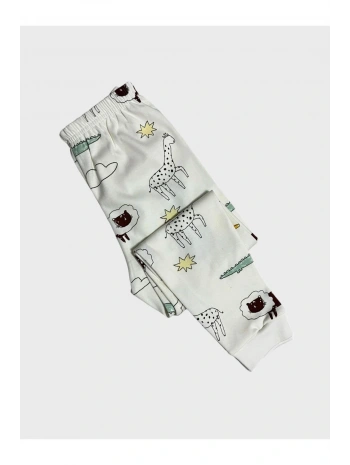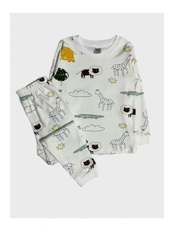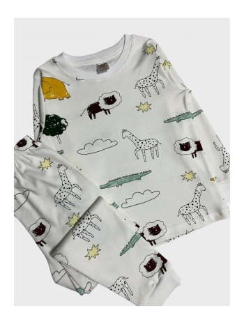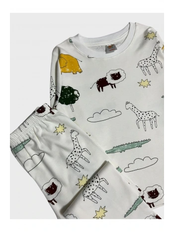 Erkek Çocuk %100 Pamuklu Safari Desenli Beyaz Uzun Kollu Pijama Takımı