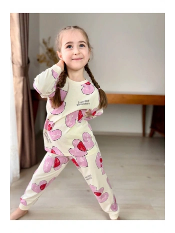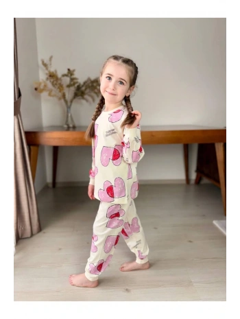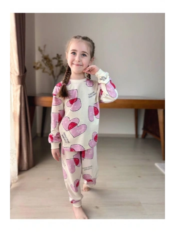 Kalp Baskı Detaylı %100 Pamuklu Mevsimlik Kız Çocuk Pijama Takımı Koçak Kids