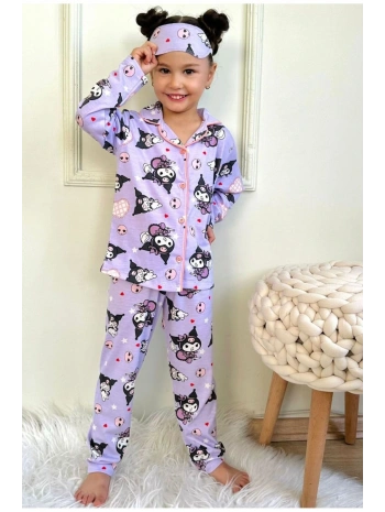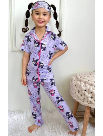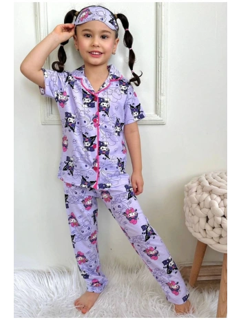 Kız çocuk düğmeli kısa kollu Kuromi pijama takımı göz bandı dahil