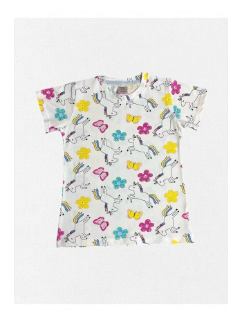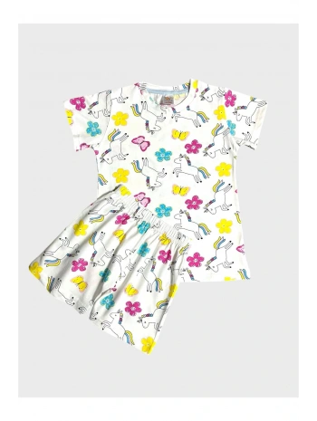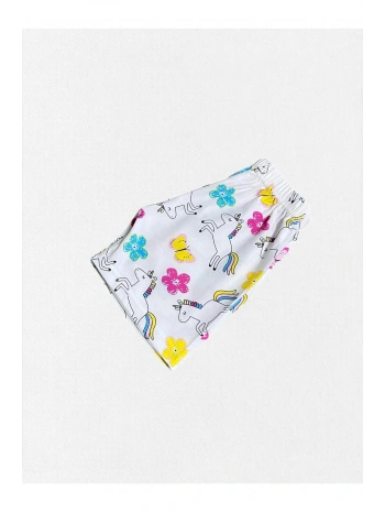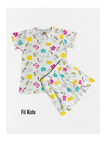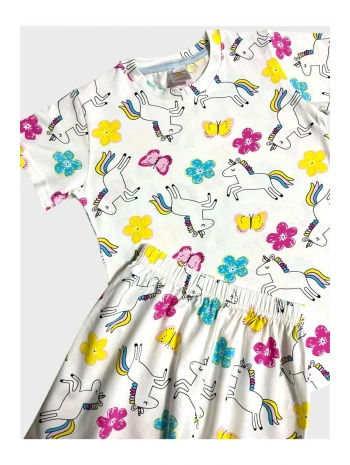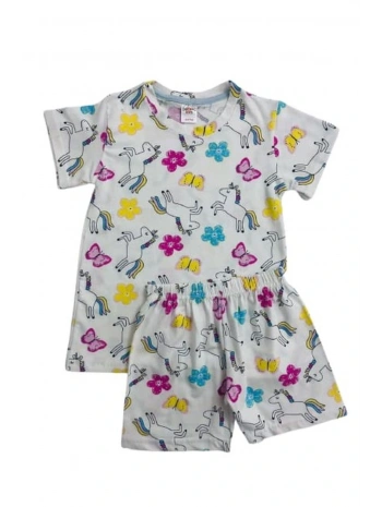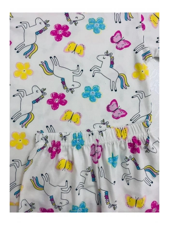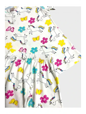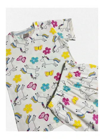 Kız Çocuk %100 Pamuklu Beyaz Unicorn Çiçek Kelebek Desen Kısa Kollu Şortlu Pijama Takımı