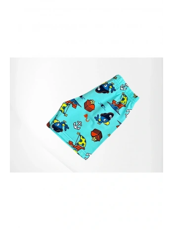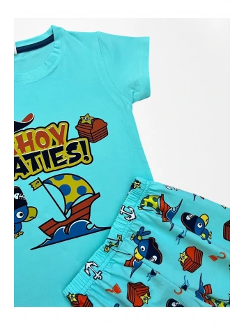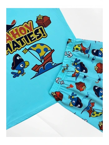 Erkek Çocuk %100 Pamuklu Papağan Yelkenli Gemi Desenli Mavi Kısa Kollu Şortlu Yazlık Pijama Takımı