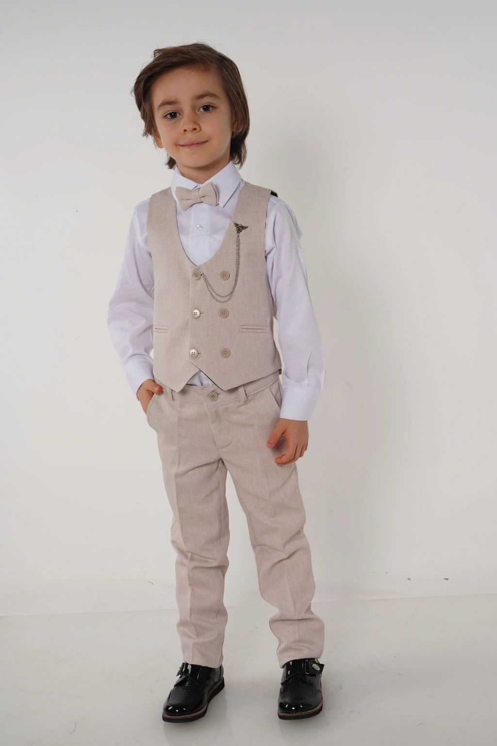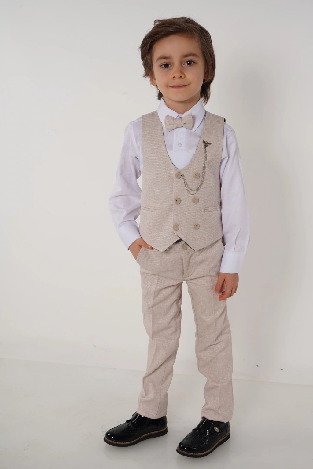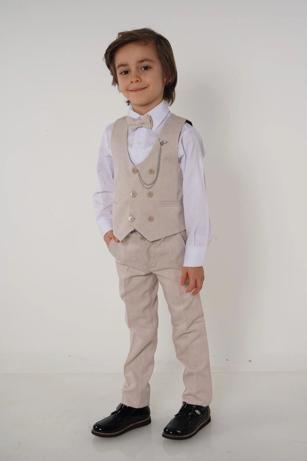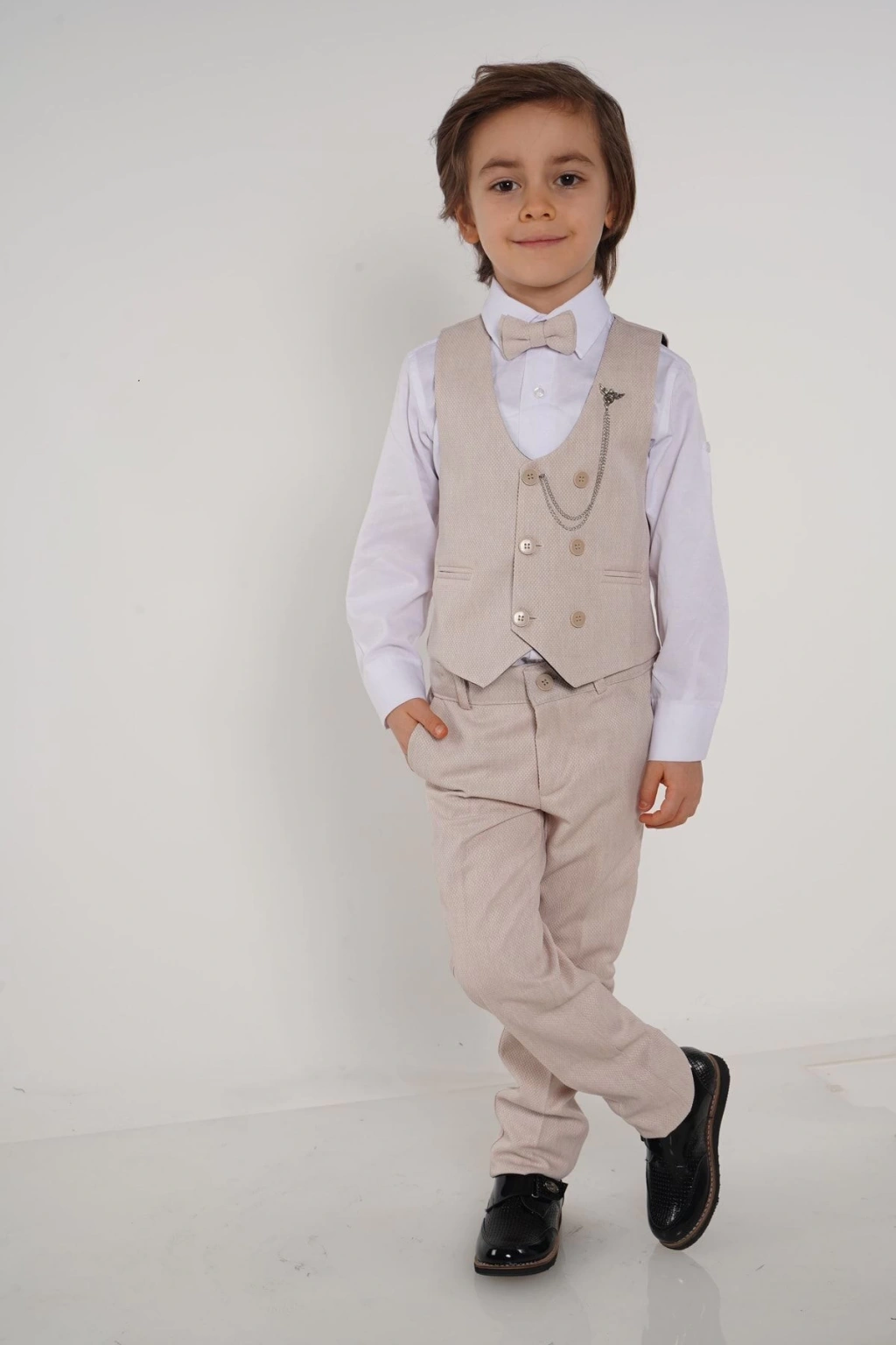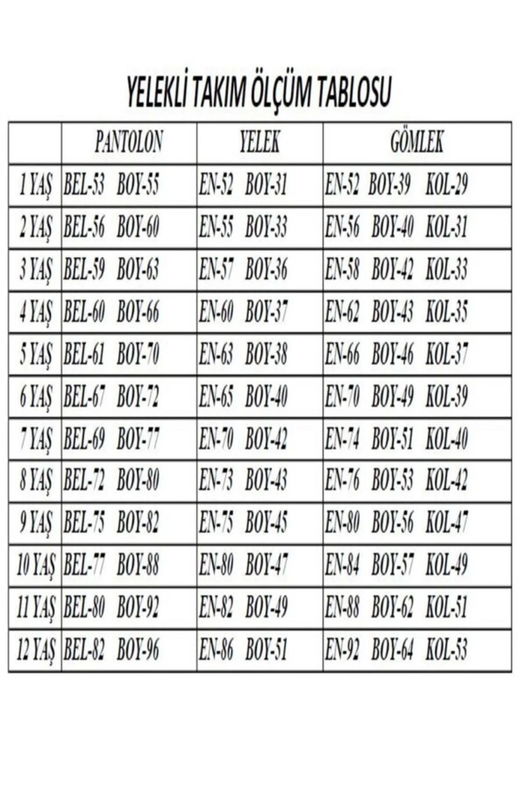 Kırlangıç yaka tasarımı ile şıklığı ve rahatlığı bir arada sunan erkek çocuk takım elbise, özel günlerde ve günlük kullanımda ideal bir tercih; Suni süet detayları ile zenginleştirilmiş yelek, takım elbisenin genel görünümüne zarif bir dokunuş katıyor; Katlamalı kol tasarımı sayesinde hareket özgürlüğü sağlayan bu takım elbise, çocukların rahat etmesini sağlıyor; Hem gündüz hem de gece etkinlikleri için uygun olan bu takım elbise, her ortama uyum sağlayacak şekilde tasarlandı; Slim fit kalıbı ile modern ve şık bir siluet oluşturan bu takım elbise, çocuğunuzun vücut hatlarını nazikçe sarıyor; %65 pamuklu materyali sayesinde nefes alabilen yapısıyla gün boyu konfor sunarken, %35 polyester içeriği dayanıklılığı artırıyor; Çocuklar için özel olarak tasarlanmış bu takım elbise, beli lastikli yapısıyla kolay giydirme ve çıkarma imkanı sağlıyor; Dokuma kumaş tipi, dayanıklılığı artırarak uzun süreli kullanım;