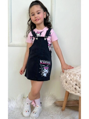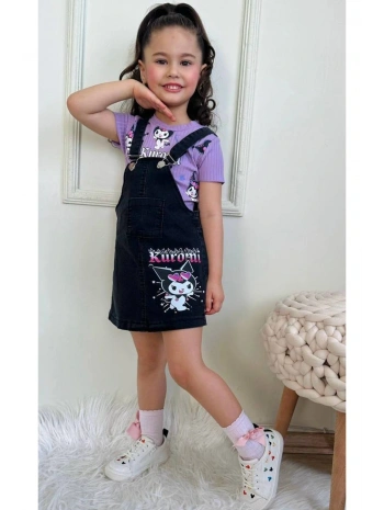 Kız çocuk Kuromi kısa kollu ve siyah salopet denim ikili takım
